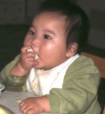 | ◆固形食移行期:手づかみ食べをしよう 乳汁から色々なものが食べられるようになっていく時期を固形食移行期と呼んでいます。離乳期と時期が重なりますが、乳から離れるという消極的な意味ではなく、食べられるものの範囲を広げていくという積極的な意味をこめ固形食移行期と呼びたいと思います。生後5、6ヶ月になると、赤ちゃんは大人の食べているものをじーっと見るようになり、よだれを流し、家族が食べているものへ手を伸ばすようになります。このような赤ちゃんが出すサインを見落とさず、食べられるものの範囲を広げていくことが大切です。 |